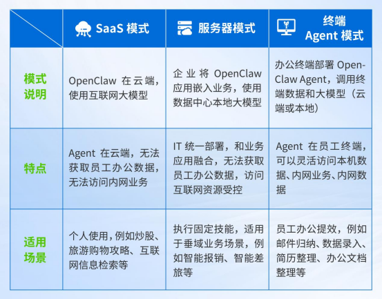 OpenClaw在企业实际落地过程中,逐渐形成了三种各具特色的部署形态——SaaS模式、服务器模式和终端Agent模式。这几种模式在能力边界与安全风险上各有侧重,也对应不同的落地场景。