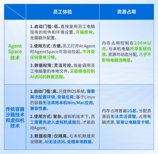 通过容器沙箱、终端虚拟机等技术划定Agent的“工作域”,以系统级隔离严格限制其行为边界。这种思路确实能守住安全底线,但代价同样明显——无法复用员工电脑的数据、应用,且性能占用高,往往会让员工体验大打折扣,背离了提效的初衷。