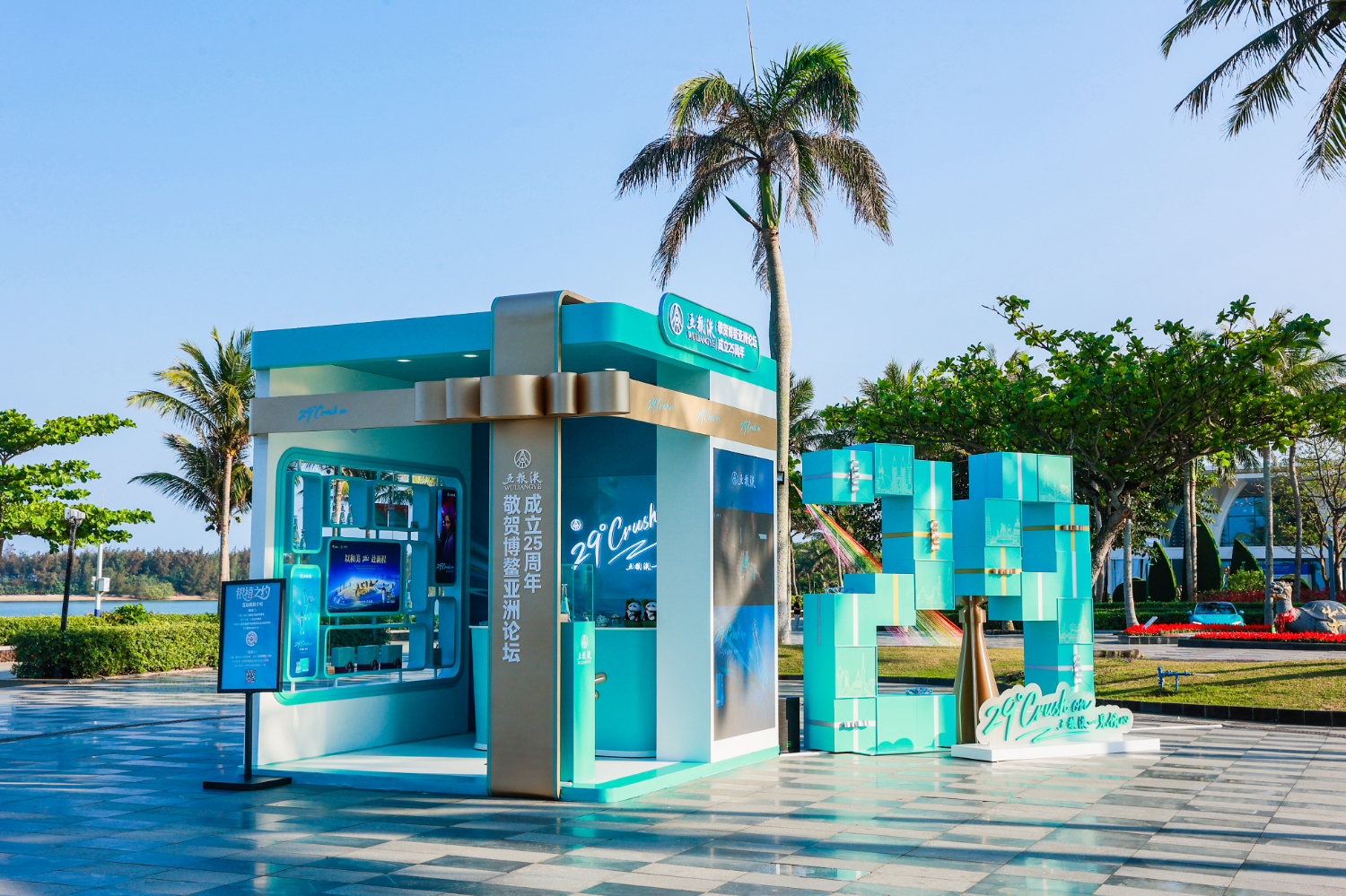 步入论坛核心区域,映入眼帘的是以“打开的礼物”为设计灵感的户外品牌快闪空间。空间紧扣“29°五粮液·一见倾心”主题,巧妙融入29个成员国标志性建筑剪影,完成“礼赞”心意的具象表达。
