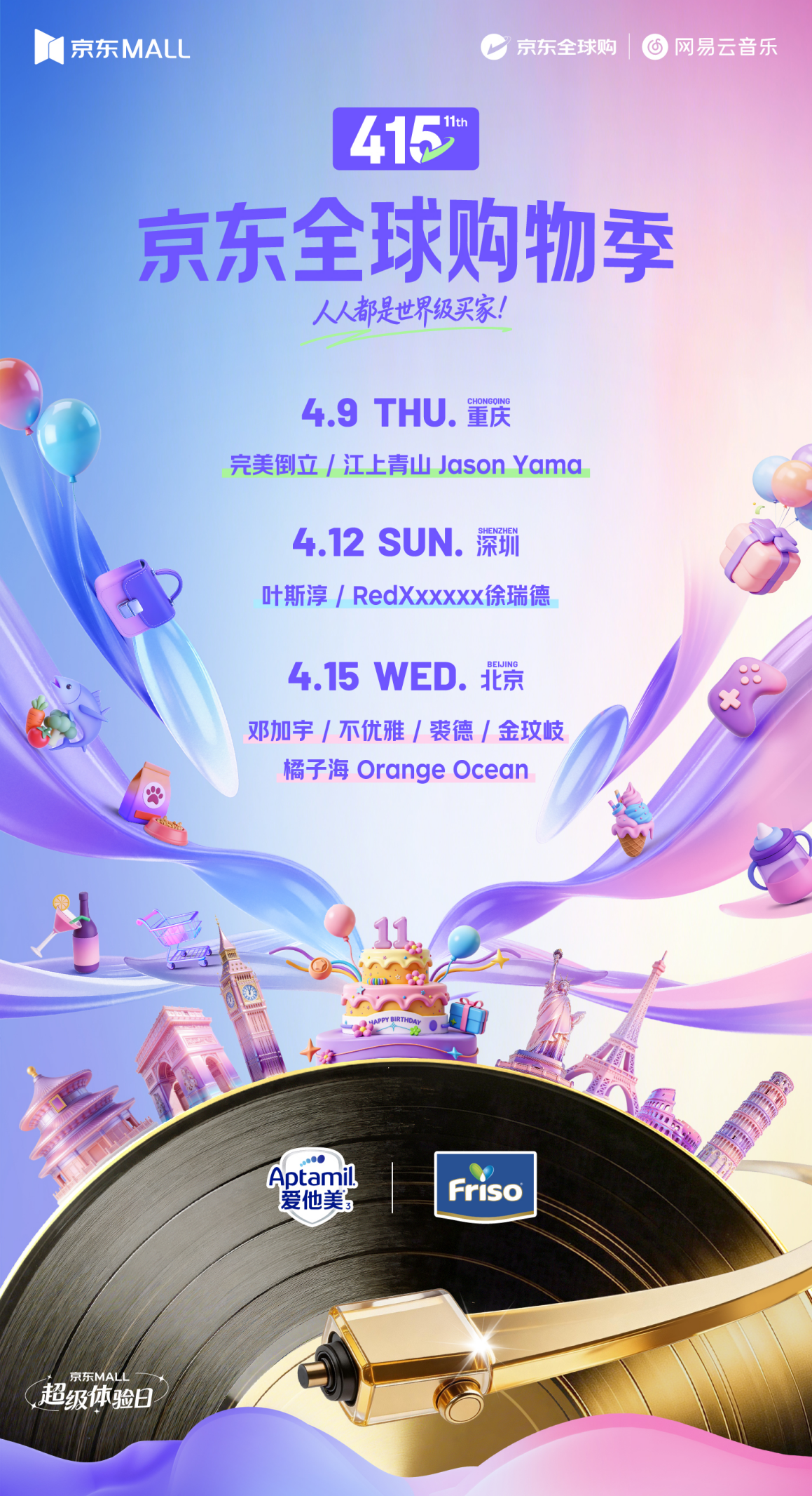 线上钜惠不断,线下精彩同样不容错过。本次京东全球购11周年庆联合网易云音乐打造“唱响城市,畅享全球”系列线下音乐会,4月9日重庆、4月12日深圳、4月15日北京三场演出依次开启,完美倒立、江上青山、金玟岐、橘子海等风格各异的音乐人倾情加盟,曲风涵盖indie pop、R&B、摇滚、爵士等多种潮流风格,结合城市气质打造专属音乐体验。消费者参与现场打卡活动,还能解锁专属福利,实现音乐体验与全球好物体验的双重享受。