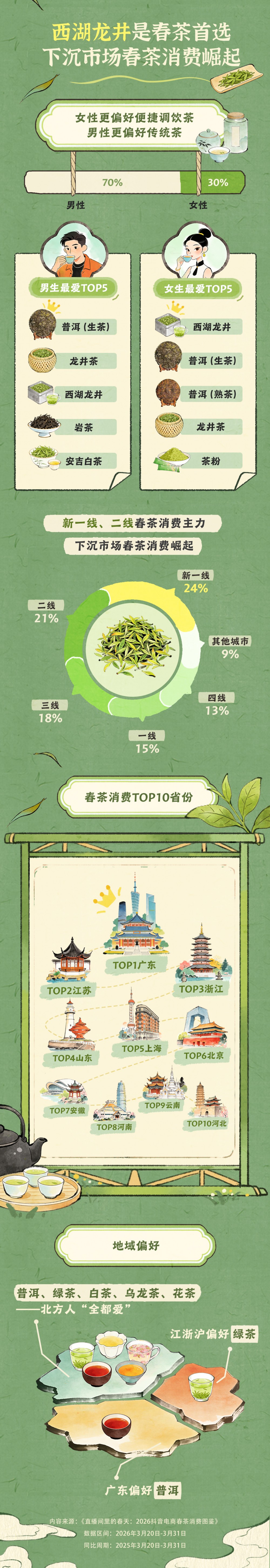 从消费偏好看,春茶也呈现出更细分的选择逻辑。报告显示,春茶消费人群中男性占比70%、女性占比30%。西湖龙井是春茶季所有消费者的首选,女性更偏好便捷调饮类选择,如茶粉;男性更偏好传统茶类与经典名茶。