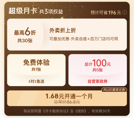 该卡原价86.8元,上新期间仅售6.18元,PLUS会员及外卖新用户更可享1.68元超低价,真正实现“一单回本”。其中,30张外卖折扣券可叠加平台百亿补贴优惠实现折上折、最高享6折,外卖自提均可用,覆盖全国百万门店。