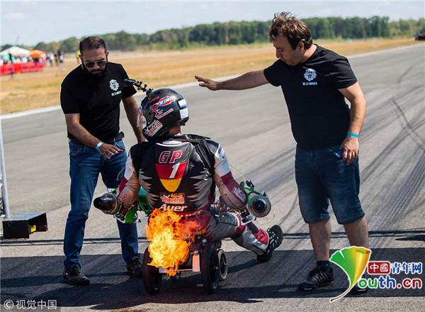 当地时间2018年8月5日,德国博特罗普,德国极限运动员Dirk Auer试图在赛车中破世界纪录,不料所使用的喷气动力波比车着火,技术人员紧急降温灭火。最终Dirk Auer还是以119.68 km/h的速度创造新的世界纪录。