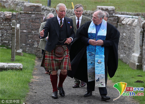 英国威尔士亲王访问苏格兰 穿方格裙造访教堂