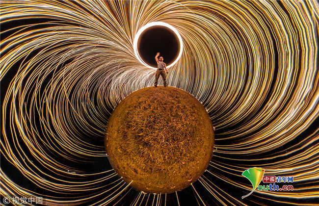不论是光绘这种拍摄手法还是全景照片这种拍摄形式,相信大家都不会陌生了,但澳洲摄影师Rod Evans却将这两者巧妙地结合在了一起,拍摄出一系列宛如“火花星球”般的光绘作品。摄影师先是将一部360°全景相机固定在脚架上,放置在大约两米外的位置,并开启15s自拍模式、将快门速度设置为20s,然后再跑到拍摄位置将钢丝棉点燃并旋转钢丝棉,从而创造出火花四溅的夺目画面。
