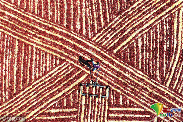 当地时间2018年9月6日,土耳其加济安泰普,一架无人机拍摄到的工人们晒辣椒的场景。红辣椒被摘下来之后,工人们把它们铺在地上,在高温下晒干,然后把它们截成几段,最后通过机器制成薄片状的干辣椒。