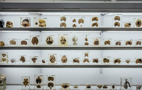 博物馆所展出的大脑器官通常患有老年痴呆症、帕金森症、精神分裂症等各类疾病,有的还会出现溢血症状。除此之外,人体的其他部位也会向公众展出,如重度吸烟者的肺部、胰腺、肾脏、心脏、喉头以及完整的骨架。