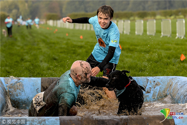 英国举办慈善泥地赛跑 狗狗与主人泥浆中共进退