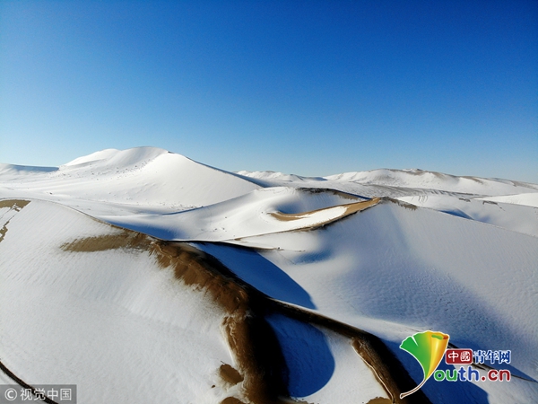 2019年1月21日,甘肃酒泉,雪后的敦煌市鸣沙山月牙泉景区雪景如画、美不胜收。