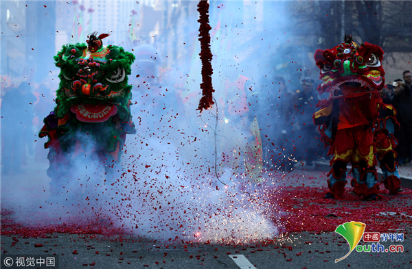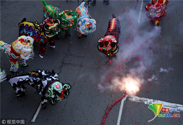 当地时间2019年2月5日,美国加州旧金山,当地举行放爆竹、舞龙舞狮等传统庆祝活动,庆祝农历新年。