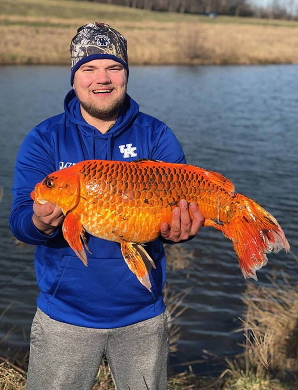 美国渔夫亨特·安德森(Hunter Anderson)表示,他周末在博伊尔郡的一个私人池塘钓鱼时,只用了一块饼干就钓到了这只20磅重的大金鱼。