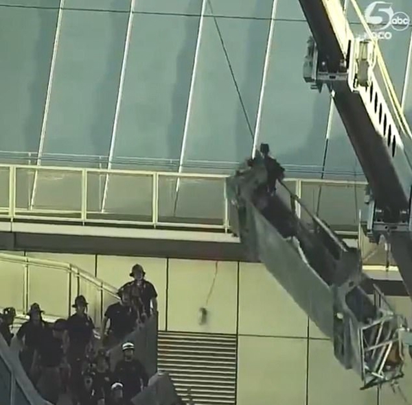 当消防队员试图从德文塔营救工人时,吊篮失去控制
