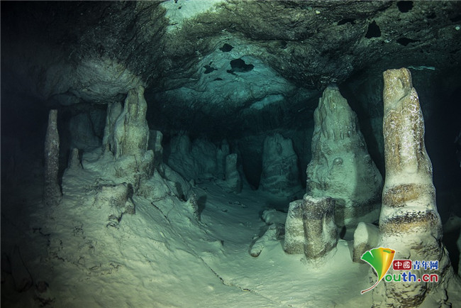 当地时间2019年5月31日,土耳其哈塔伊,科尔火山底部发现一个地貌像极了“精灵烟囱”的水下洞穴。这是土耳其Anadolu Agency首次观测到水下洞穴。