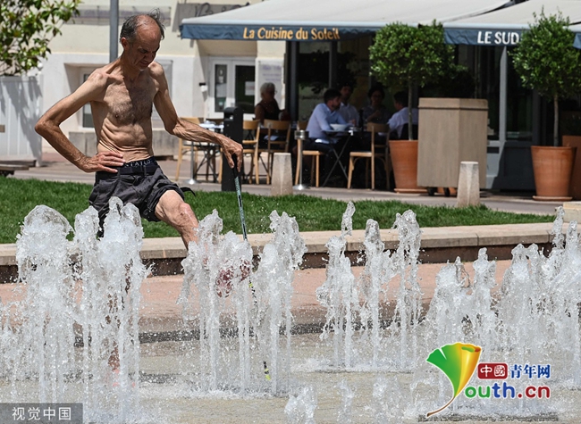 巴黎迎来高温天气 市民喷泉池内冲凉消暑