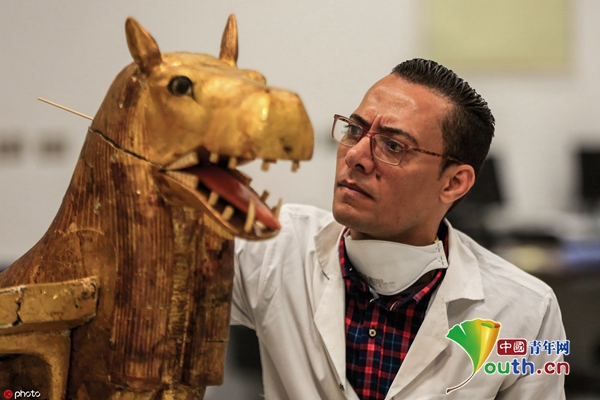 当地时间2019年8月4日,埃及吉萨,考古学家们为图坦卡蒙法老的金棺正式开始修复工作。