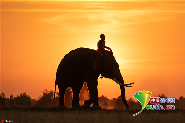 绝美!泰国大象与背上农民日落时分剪影宛如油画