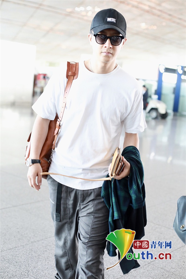 2019年9月27日,北京,韩庚现身机场。他戴着棒球帽身穿白T恤和长裤身材挺拔,脚踩黄色靴子背着驼色挎包拿着外套一路快走,不时与身边人热聊十分放松。