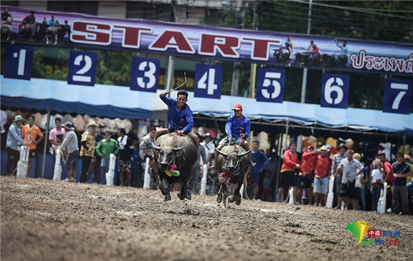 泰国举行年度水牛赛跑 选手骑牛狂奔惊险刺激