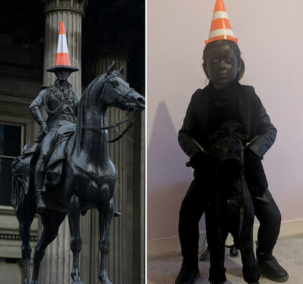 今年万圣节,Siobhan为女儿制作的是一套惠灵顿公爵造型的服装。她把Caoimhe不要的木马进行了改装,又从网上购买了二手的黑色皮夹克衫、锥形警告路标和紧身裤,与女儿自己的黑上衣和靴子搭配在一起,完成了整套造型,一共只花费了25英镑(227.6元人民币),这也是她所制作的最贵的一套服装。