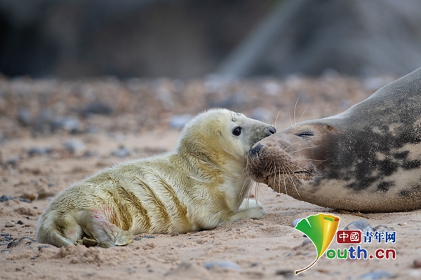 母子情深 英国海滩灰海豹宝宝深情亲吻妈妈