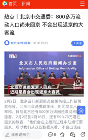 在2月2日举行的北京市新型冠状病毒感染的肺炎疫情防控新闻发布会上,北京市交通委副主任容军表示北京目前还有800多万应该回而还没回来的旅客。从数据来看,不会出现集中返京的大客流。2月2日到2月18日有200多万人已经订票,还有593万潜在回京旅客,会逐步订票回京。