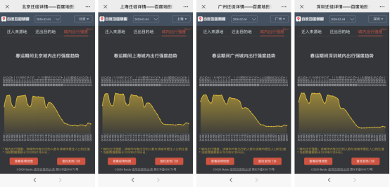 在城市出行强度方面,以北京、上海、广州、深圳等一线城市为例,可以看出大部分城市年后的出行强度整体明显降低,近几天因返程复工而略有回升。据悉,城市内出行强度趋势数据来自该城市出行人数与常住人口的比值,能够基于此分析城市目前出行状况,实施合适的防控举措。对于媒体、科研单位、政府部门开展工作具有参考价值。