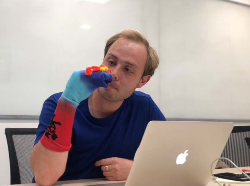 “你也可以有这样一个不会说中文的朋友,这样你就可以每天跟它练习说英语了。”蓝色布偶扭了扭身子,向上一伸腰,原来是王富贵把一只袜子套在手上装扮出来的“朋友”。