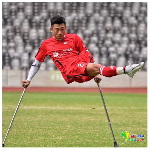 失去一条腿的痛苦并没有将何忆义打倒。正规的足球赛场不能再去了,那就自己练球,和朋友踢友谊赛。出院后休养了没多久,还不能熟练地依靠双拐走路的他,就开始练习拄着双拐单腿踢球了。