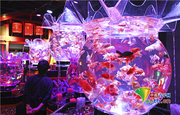 当地时间2020年8月27日,日本东京,艺术水族馆向媒体开放,约30000条金鱼在鱼缸中遨游,在灯光照明下美轮美奂。