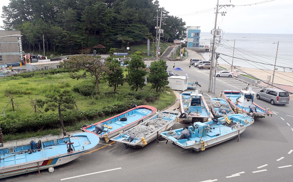 当地时间2020年8月31日,韩国釜山,台风“美莎克”来袭,渔船被撤离到路边。 今年第9号台风“美莎克”的中心今晨3时位于日本冲绳以南约660公里洋面,现以时速28公里的速度缓慢北上,预计将于9月2日登陆韩半岛南部。