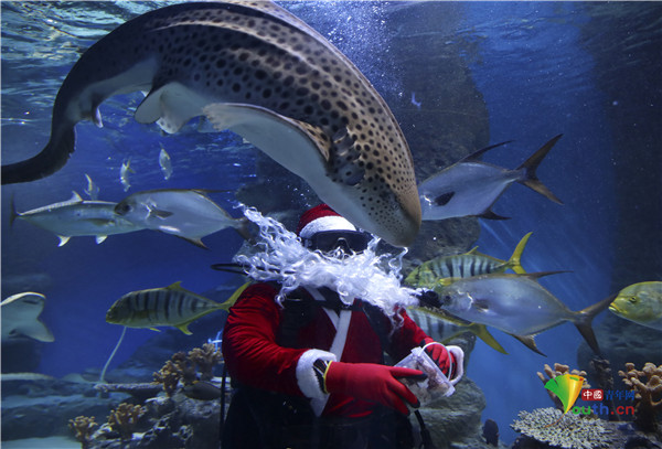 俄罗斯水族馆潜水员扮圣诞老人 与鱼儿共舞