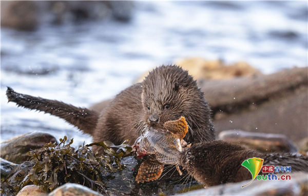苏格兰布特岛,两只水獭宝宝为了争夺美食鲉鱼,上演“拔河”式拉锯战,这条鲉鱼是水獭妈妈猎捕的,而拍摄这一系列精彩画面的是摄影师David Mercer。