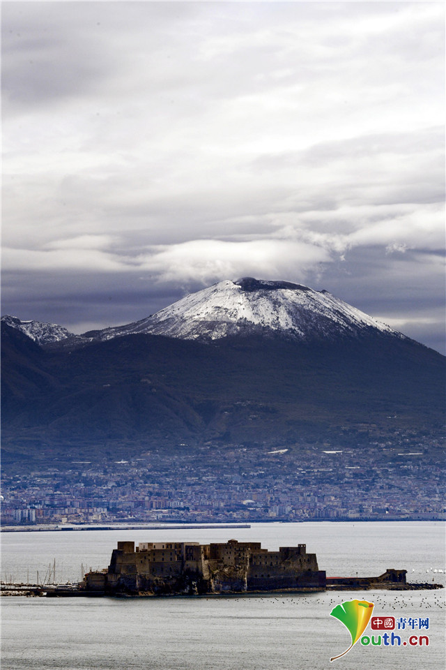 当地时间2021年3月20日,意大利那不勒斯,春来了,维苏威火山依旧冰雪冠顶。