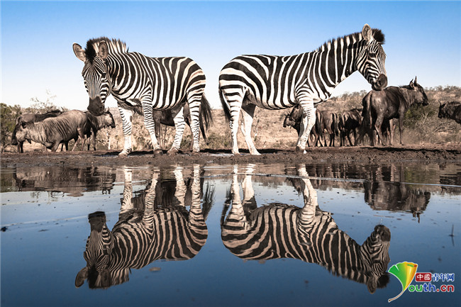 南非Zimanga自然保护区,斑马在水坑边饮水时倒影出现在水面上。Zimanga自然保护区为野生动物摄影师提供了绝佳的拍摄视角。