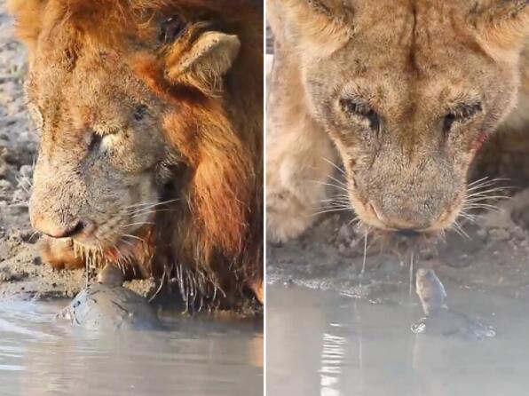 当时,一只雄狮和一只雌狮刚捕食完猎物,嘴上挂着鲜血,它们来到一个小水坑喝水,然后一只小乌龟从水里冒出头来,丝毫没有畏惧地靠近狮子。它游到雄狮的嘴下面,试图顶它,雄狮没有理会继续喝水。过了一会儿,小乌龟又游到雌狮跟前,顶它的嘴,似乎不想让它继续喝水。虽然小乌龟的行为让狮子们有些恼火,但它们依然继续喝水直到喝饱为止。