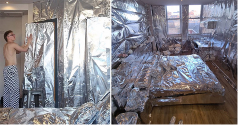 据英国《都市报》5月5日报道,来自诺丁汉的21岁男子Nat Openshaw用360米长的锡纸将邻居好友的房间全部包裹起来。