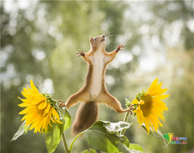 2021年5月28日报道,瑞典,这一系列由摄影师Geert Weggen拍摄的精彩画面,展示了红松鼠令人印象深刻的体操技艺。其中一张照片里,这只可爱的红松鼠在两朵向日葵之间张开双腿“劈叉”却仍然保持平衡,另外一张照片里,它抓住了向日葵的花茎准备“闻香识花”。