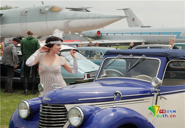 当地时间2021年5月28日,乌克兰基辅,在“OldCarLand”汽车展上,一名身着古装的女子在一辆旧车旁摆姿势。展览在乌克兰航空博物馆的一个地点举行,展出了世界上不同生产商的数百辆旧车和摩托车。