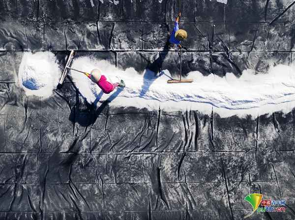 越南平定省,工人们用整晚的时间,将黑色帆布上的盐耙的平整。海水在海滩上进行晾晒,以便工人们收集内含的盐。工人们戴着帽子保护自己免受阳光暴晒。晾晒出的盐被平铺在帆布上,然后被聚成堆,以便收集至存储装置中,然后会被分发至各个商店。42岁的IT工程师Nguyen Quocn Guyen拍摄到这些照片,他表示:“这些照片是在工人的盐田工厂外拍摄的。当时我仅仅是想捕捉那些生产我们生活必需品的艰苦工作的工人们的状态。”