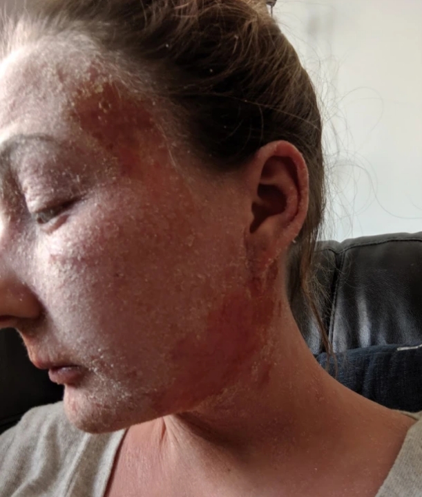 据悉,来自加拿大渥太华的27岁女子Brittany Stephens对鸡蛋、奶制品和坚果等食物过敏,皮肤容易受到刺激而起湿疹。起初,她只在冬天使用类固醇霜来缓解因冷空气刺激而产生的皮肤轻微炎症,两年后,因皮肤受到公寓里的霉菌刺激,她开始全身涂抹,没想到皮肤从轻微发红和干燥斑块变成了火烧一样的红,并蔓延到手臂、腿和脸。Brittany说“感觉就好像着火了一样”。她会不断颤抖,视力也出了问题,水流在皮肤上感觉像酸一样。接着皮肤开始不断脱落,渗液,眼睛和嘴唇周围的伤口如同刀割,吃东西都变得困难。此外Brittany还感到瘙痒,每晚只能睡4个小时。她在ins上寻找是否有和她经历相似的人,惊讶地发现有一个群体患有局部类固醇戒断综合征 (TSW),长期使用类固醇乳膏的人在停止使用后会出现严重的症状——包括干燥、发红和片状的皮肤。