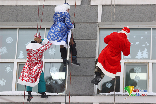 当地时间2021年12月30日,俄罗斯新西伯利亚,当地救援队装扮成圣诞老人空降儿童医院窗前,探望生病孩童并送去圣诞祝福。