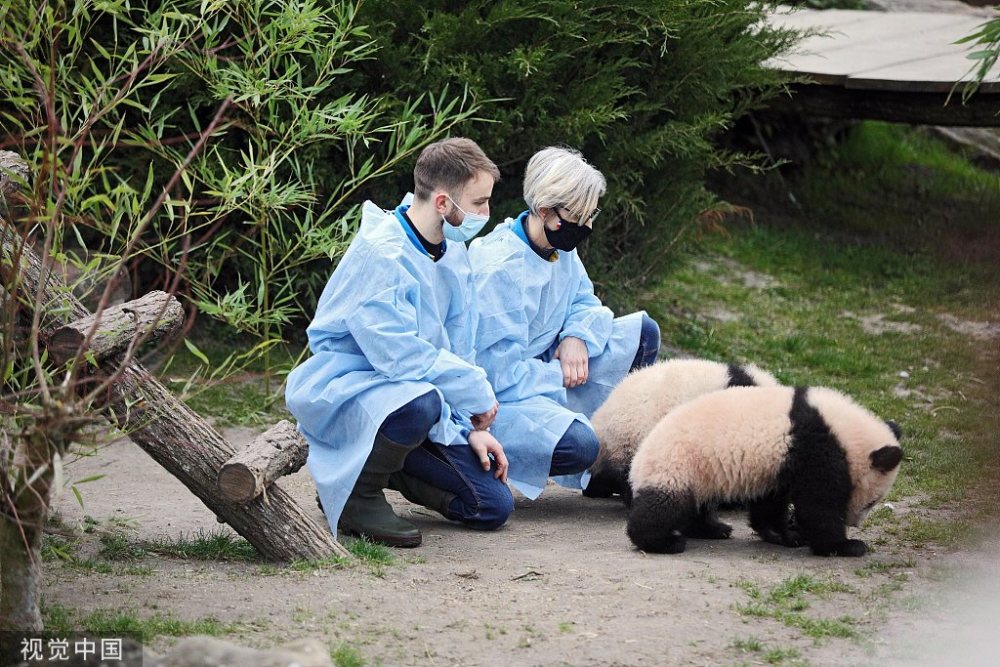 当地时间2022年3月11日,法国博瓦勒动物园,旅法双胞胎大熊猫“欢黎黎”与“圆嘟嘟”与游客见面。
