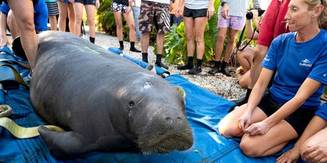 本周二,来自佛罗里达鱼类和野生动物保护委员会、海豚研究中心、佛罗里达礁岛水族馆邂逅和海洋世界的工作人员帮助这三只海牛从运输卡车上转移到陆地上,然后归放入水中。