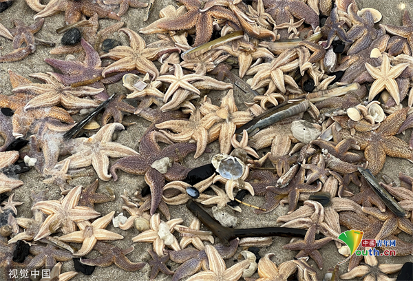 当地时间2023年2月22日,德国石勒苏益格-荷尔斯泰因州,大量被冲上岸的海星躺在Wenningstedt海滩的沙子上。由于冬季天气多风暴,步行者可以在北海和波罗的海的海滩上发现数百只海星。