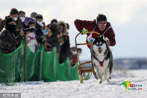 当地时间2023年2月25日,日本稚内市,参赛者在举行的第38届全日本狗拉雪橇比赛中比赛。