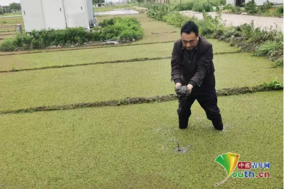村民在田中展示“绿萍”有机肥料。今年蒋巷村计划在1000亩的田地中使用这种有机肥料,“绿萍”具有环保、高产的优势。中国青年网记者张秋红摄