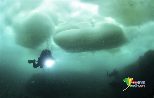 当地时间2024年2月19日,日本北海道,浮冰漂浮在海面上,潜水员潜入被冰雪覆盖的Utoro海。Utoro位于被列为世界自然遗产的知床半岛中部,每年1月中旬到3月中旬,浮冰会涌向海岸。