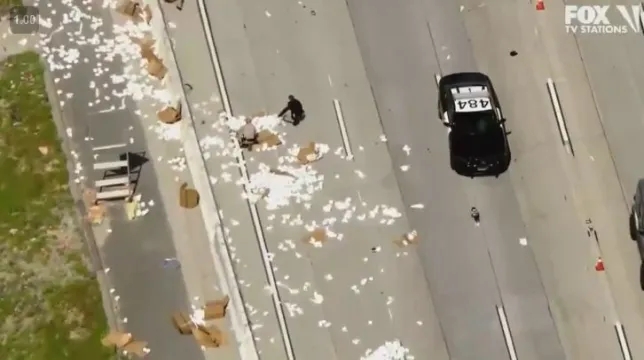 加州公路巡警局表示,大约有3大箱卫生纸从一辆福特F-350上掉落,导致2条车道交通堵塞数小时。从图片上可以看到,数不清的卫生纸散落在马路上,4名警察正在清理路面。据悉,清理过程持续了约20分钟。
