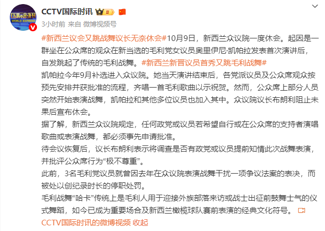 此前,3名毛利党议员就曾因去年在众议院表演战舞干扰一项争议法案的表决,而被处以创纪录时长的停职处罚。