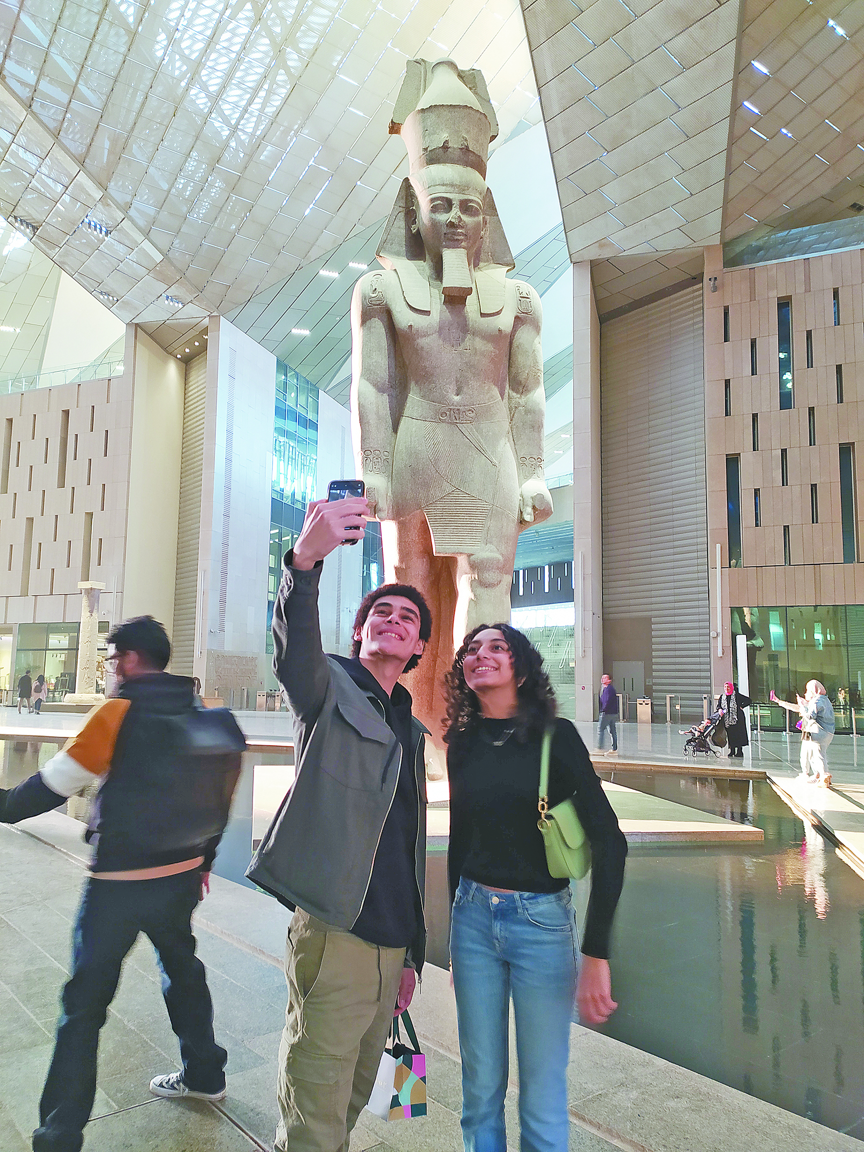 沿着6层楼高的电动扶梯缓缓而上,左侧是一条长长的雕像长廊,近百尊跨越各时代的法老与神祇石像阵列其中,如同被时光定格的庄严仪仗,静静守候着埃及的文化。当游客抵达阶梯尽头的平台,一抬头,整片吉萨金字塔群正透过顶天立地的巨大玻璃幕墙扑面而来。此刻,光洁的现代建筑奇迹与千年沧桑的巨石丰碑,奇迹般地在同一方玻璃画幅中温柔叠印。
